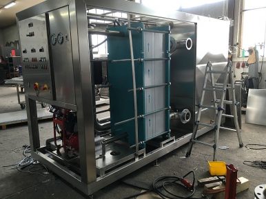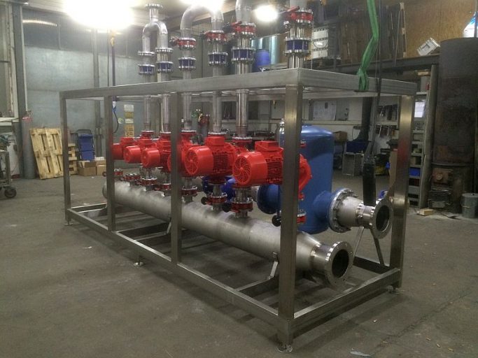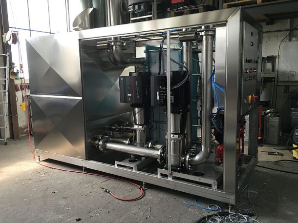 Hydronic modules or pump stations are mostly used to maintain a certain operating pressure in branched piping systems. In combination with a heat exchanger (usually a plate heat exchanger), a 2-circuit cooling or heating system can also be set up. This is used, for example, when there is an increased risk of contamination of the cooling or heating medium with the product.